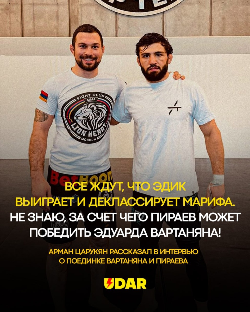 ⚡️Ждут, что Вартанян деклассирует Пираева. Экс-претендент на пояс UFC Арман Царукян дал прогноз на бой Эдуарда Вартаняна и Марифа Пираева, который пройдет 16 августа в прямом эфире канала UDAR: 💬 «Если Вартанян будет не мотивирован и проиграет Марифу – это будет апсет. Все ждут, что Эдик выиграет и деклассирует его. При этом Мариф – не лютый андердог: он хорошо борется. Но класс у бойцов разный. Надеюсь, что 16 августа Эдик с профессионализмом подойдет к этому бою и выиграет у Пираева. Не знаю, за счет чего Мариф может победить Вартаняна», – сказал Царукян на YouTube-канале Камила Гаджиева. За кого будете топить? ❤️ - Эдуард Вартанян 🔥 - Мариф Пираев