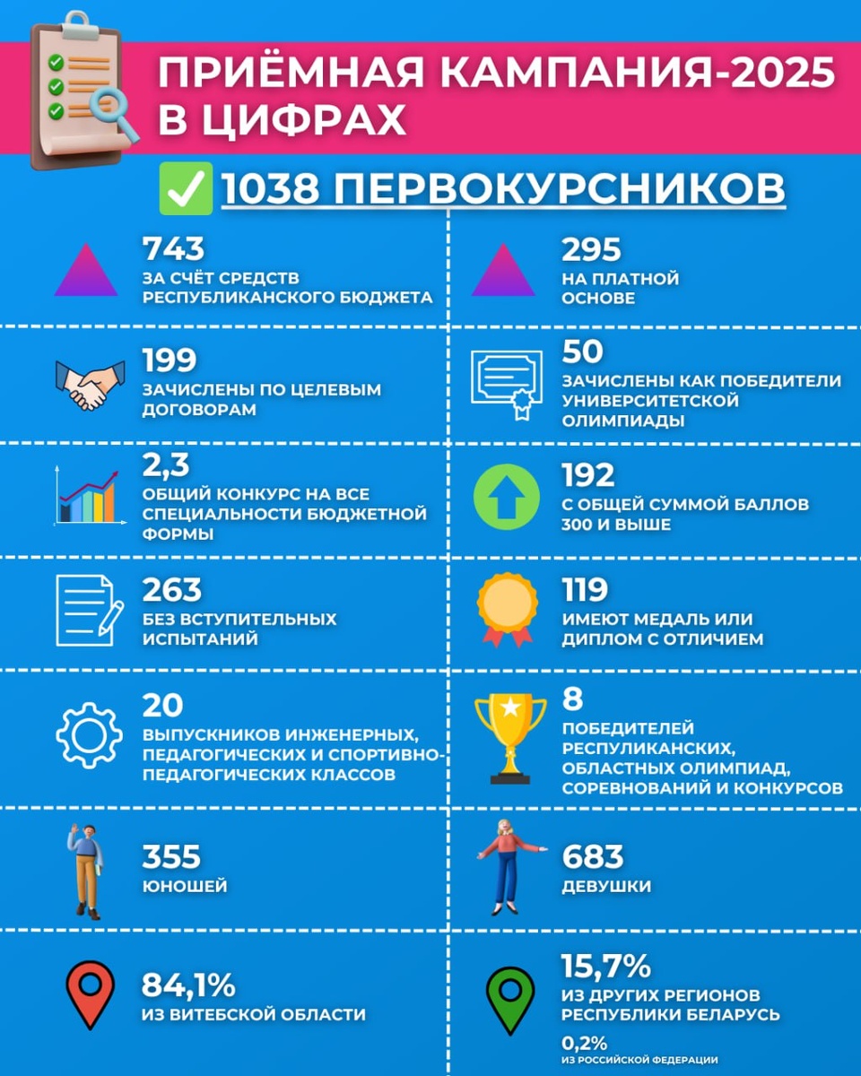 ✅Витебский государственный университет имени П.М. Машерова успешно справился с приемной кампанией этого года, приняв в свои ряды почти 1050 первокурсников и выполнив план приема абитуриентов на бюджетную и платную формы получения образования. 🗂Общий конкурс на все специальности бюджетной формы обучения составил 2,3 человека на место. 🔴600 студентов будут учиться за счет средств республиканского бюджета на дневной форме получения образования, 143 – на заочной. 🟢295 человек поступили на внебюджет (дневное и заочное обучение). ➡️Больше статистики читайте на VSU.BY #новости #абитуриенту
