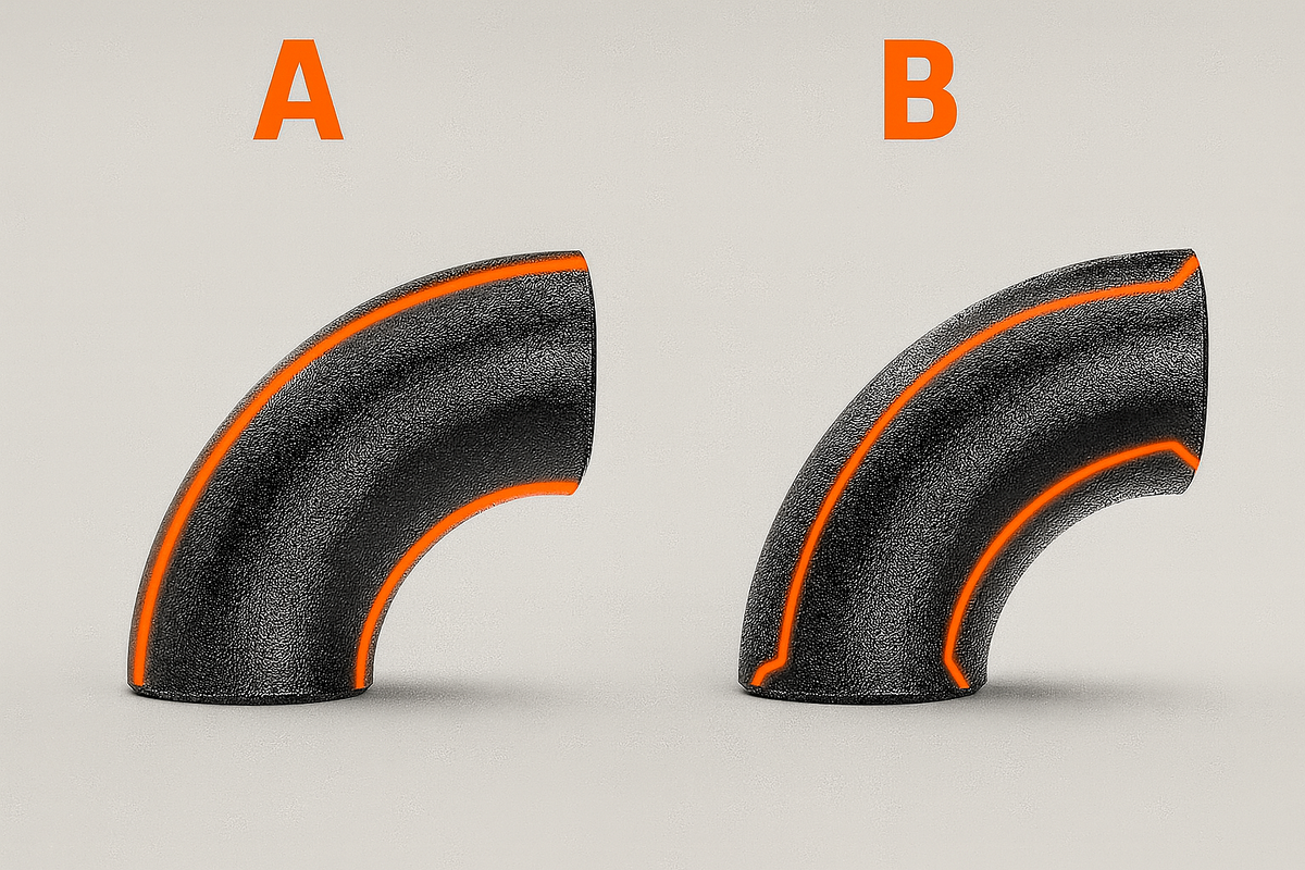 В проектировании трубопроводов один из самых важных выборов – исполнение отвода. На первый взгляд, отводы типа A и типа B по стандарту EN 10253-1 выглядят идентично. Однако не заметное на первый взгляд визуальное отличие в их конструкциях при неправильно подобранном типе может стать причиной серьезной аварии в трубопроводе под давлением. В этой статье разберем, чем эти два типа отличаются и какой выбор является оптимальным, безопасным и эффективным для конкретных условий. Несмотря на схожесть по внешним характеристикам, отводы типа A и B отличаются в первую очередь по конструктивным особенностям: Хотя их геометрия может быть схожей, особенности конструкции оказывают прямое влияние на эксплуатационные характеристики, в том числе на стойкость к деформации, герметичность и долговечность соединений. Отвод типа A из-за тонкой однородной стенки более подвержен локальным напряжениям, что критично при высоких температурах или динамических нагрузках, когда труба подвергается вибрациям или скачк