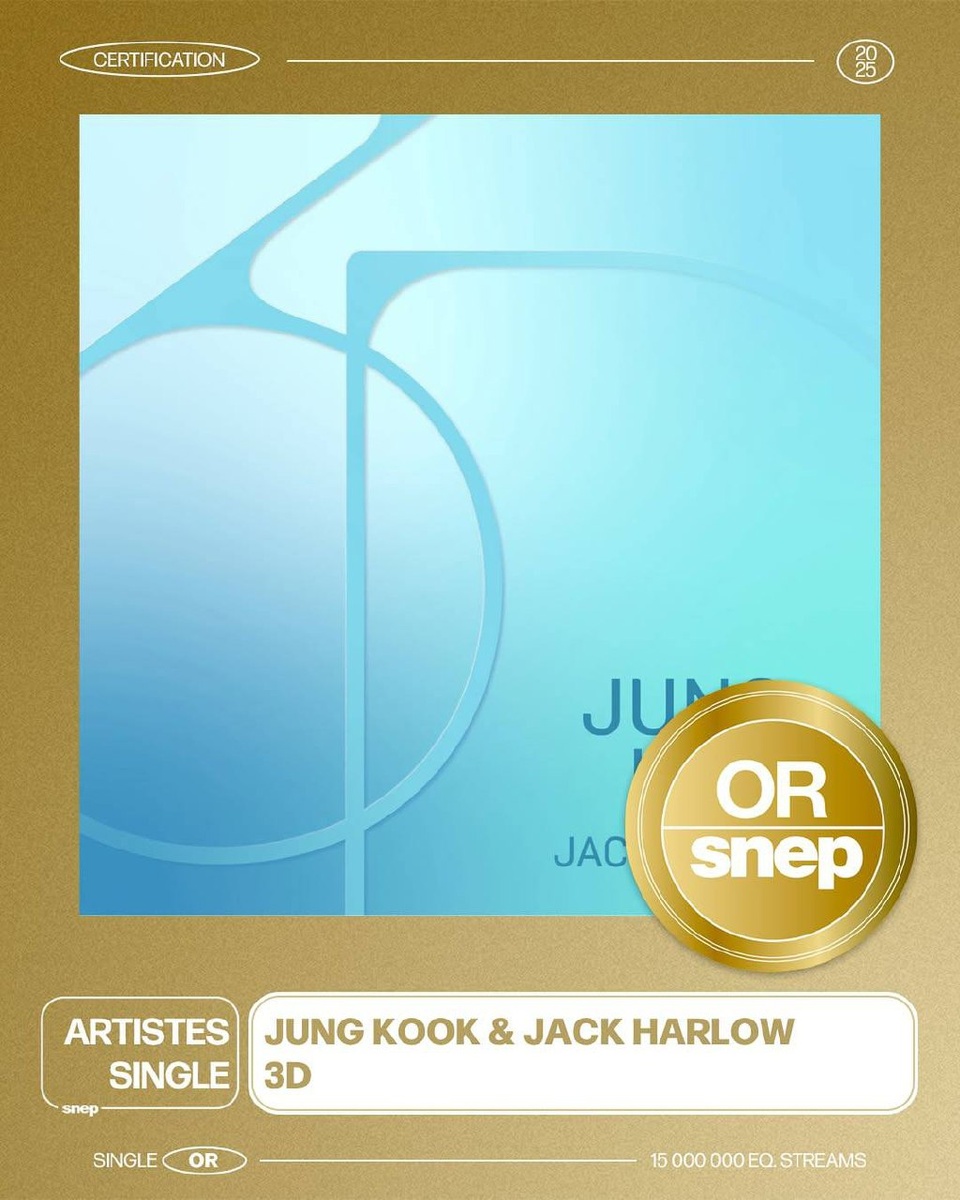 🌺 Сингл "3D" от Чонгука и Джека Харлоу получил золотой сертификат SNEP за более чем 15 миллионов эквивалентных стримов.