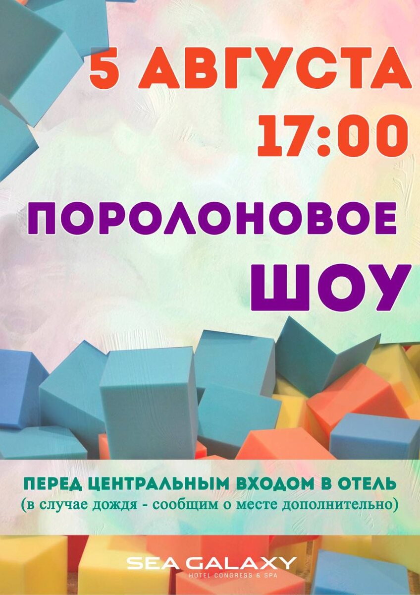 🥳Поролоновое шоу в Sea Galaxy! 📆Ждем Вас на развлекательном мероприятии 5 августа в 17:00! 🎶А в 20:00 приглашаем Вас на вечер живой музыки на летней веранде Отеля. Для Вас выступит Наталья Закора — чарующий голос и душевная атмосфера! 🙌Берите с собой хорошее настроение и приходите всей семьёй!