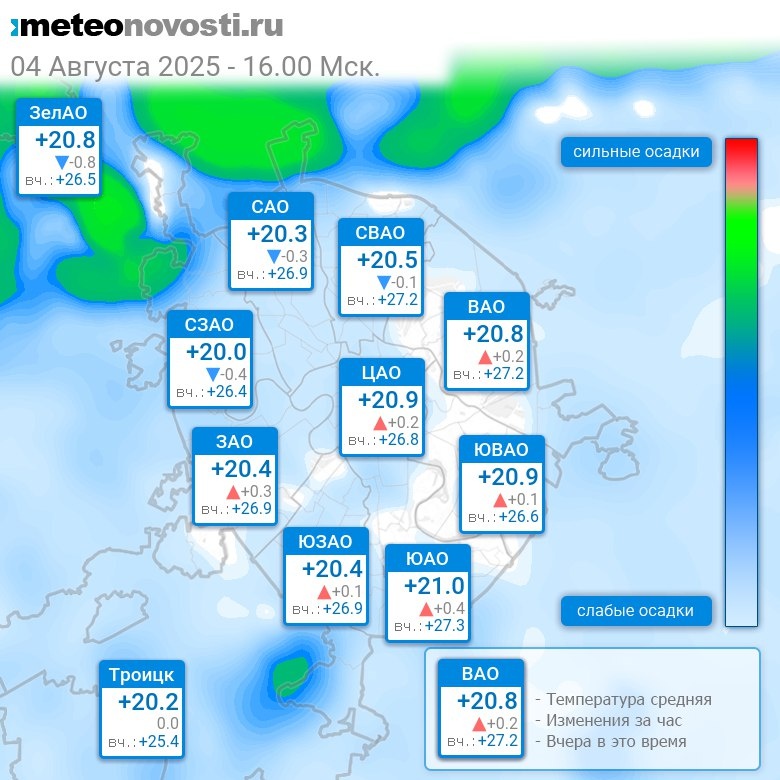 В 16:00 в Москве было от +19.7°C до +21.3°C, средняя температура +20.6°C #погода #Москва #лето #температура #4августа #понедельник