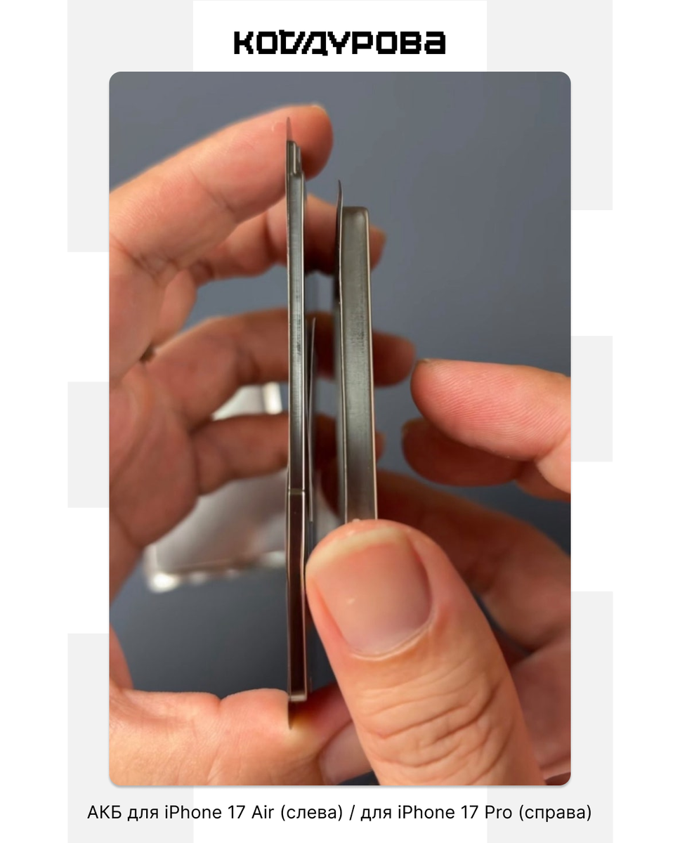 Больше новостей об IT в Telegram канале «Код Дурова» Инсайдеры опубликовали фотографии аккумуляторов iPhone 17 Air и 17 Pro. На изображениях видно, что аккумулятор для iPhone 17 Air значительно тоньше аккумулятора для iPhone 17 Pro — примерно в два раза. Толщина, вероятно, составит 2,49 мм. Предполагаемая ёмкость — около 2800 мАч. Ёмкость АКБ для Pro-версии пока не раскрывается, однако «Код Дурова» предполагает, что это значение сильно не изменится и составит около 3500–4000 мАч. Сообщения о ёмкости аккумулятора iPhone 17 Air могут быть неточными. Разные инсайдеры предоставляют разную информацию. Например, Марк Гурман из Bloomberg заявил о времени автономной работы «на уровне нынешних iPhone», а Уэйн Ма из The Information сказал, что автономность будет хуже, чем у других моделей. Также стало известно, что инсайдер Маджин Бу перепутал модели и преподнёс ультратонкую батарею, изначально предназначавшуюся для iPhone 17 Air, как аккумулятор для iPhone 17 Pro. От него же поступила новая инф