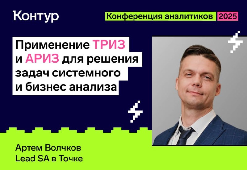 Выступаю на Конференции аналитиков Контура 20 августа Я расскажу, как ТРИЗ/АРИЗ решают сложные задачи в бизнесе и IT: — Разберу кейсы из Точки, Альфа-Банка и других компаний; — Покажу, как сократить сроки процессов на 70% через алгоритмы инноваций; — Дам готовый алгоритм для применения методов на практике. Будет интересно послушать тем, кто хочет находить неочевидные решения в аналитике и бизнес-процессах. Когда: 20 августа, в 14:40 Где: онлайн-трансляция. Участие бесплатное, но нужно зарегистрироваться. Второй день конференции пройдет в Санкт-Петербурге 21 августа. Если захотите поехать, используйте промокод на скидку — уже применен по ссылке. С ним билет будет на 30% дешевле😉