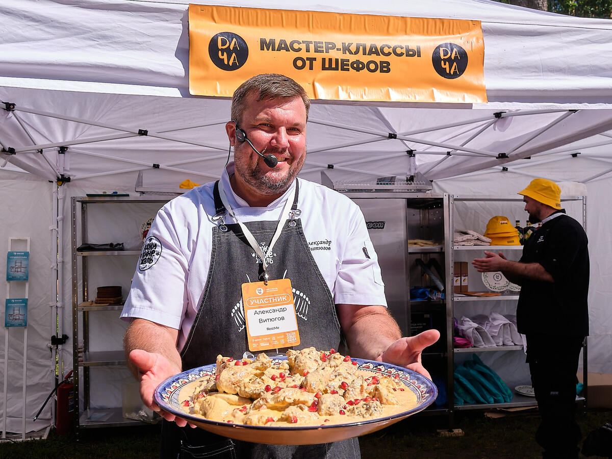 Это блюдо в интерпретации с тайским соусом приготовил на мастер-классе фестиваля рестораторов "Дача" бренд-шеф сети ресторанов грузинской кухни "Аджикинежаль" Александр Витюгов. От классического рецепта, по которому я тоже готовила, блюдо от шефа отличается добавлением в соус кокосовых сливок и пасты том-ям, что придаёт чкмерули немного другой колорит, остринку и делает его мультинациональным. Все этапы приготовления чкмерули шеф-повар показал для зрителей мастер-класса. Еще он рассказал, что все специи для ресторанов они привозят из Грузии, как и Кахетинское подсолнечное масло. Обжаренная курица очень ароматная и красивая Соус шеф готовил из кокосового молока и сливок 33% с добавлением пасты том ям. При подаче шеф украсил блюдо зернами граната и хотел посыпать рубленой кинзой, но гости попросили кинзу (не все ее любят) подать отдельно. Это, конечно, сделало фотографии блюда менее яркими. Для подачи и чтобы соус было удобнее съесть, шеф привёз из ресторана лепёшки шоти. Гости были,