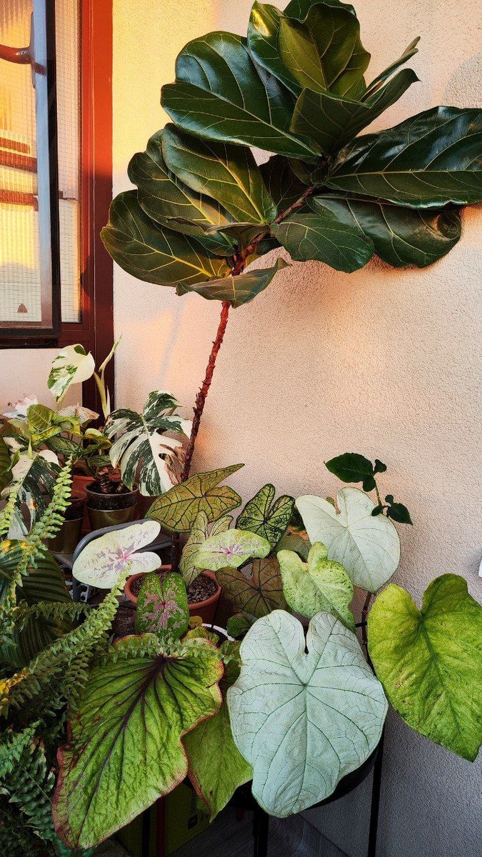 Я резко осмелела и через день после повторного падения на больное колено из-за порожка на балконе, решила снова на него выйти, чтобы снять каладиумы в закатном солнце. На переднем плане тайский красавец , второй таец живёт в теплице, наращивает свой клубень.