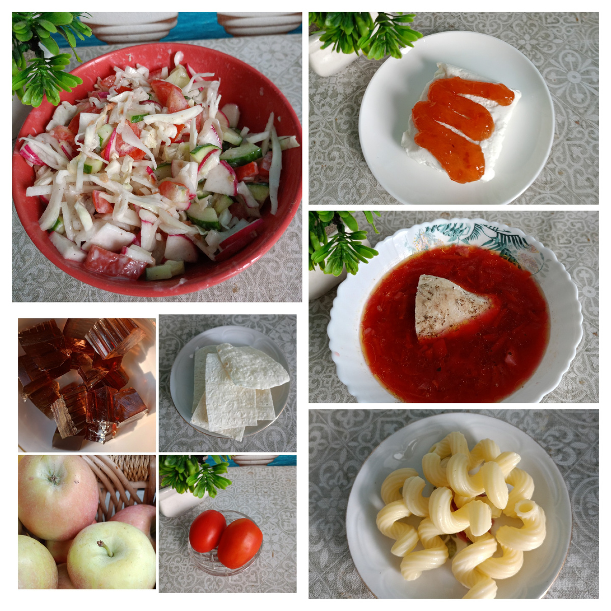 •Завтрак - салат из белокочанной капусты, огурца, лука репчатого, редиса и помидора, заправленный мацони; макароны вместо хлеба поштучно; на десерт творог обезжиренный с джемом.