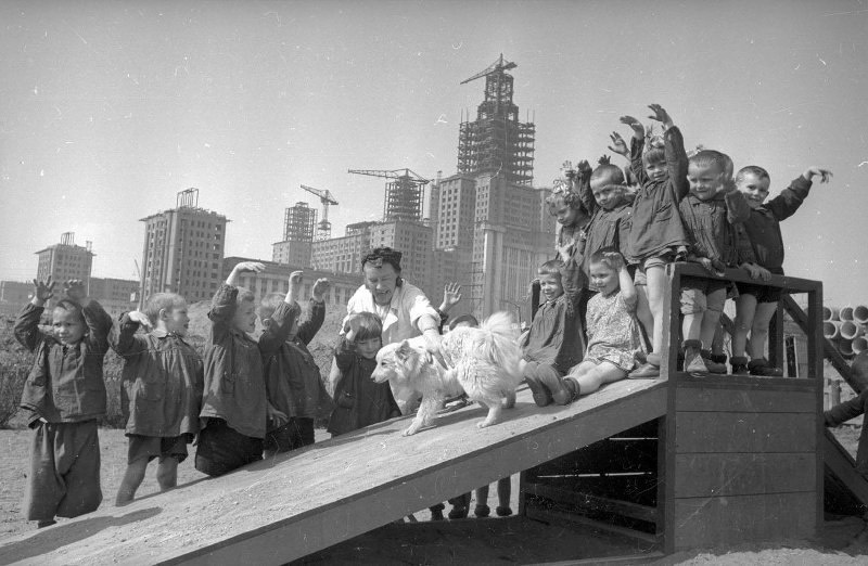 Сначала выпускники детского сада, затем — МГУ. Вон он на фоне строится. Снимок из архивов Росфото (Московский дом фотографии) был сделан в 1952 году. Эммануил Евзерихин запечатлел детский сад перед строящимся зданием Московского Государственного Университета.