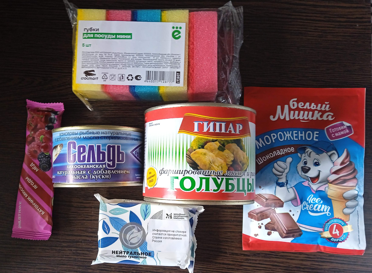 Всем привет! Не так давно в ТЦ неподалёку от нашего дома открыли новый для меня магазин "Ещё". Ребятишки со всего двора стали регулярно бегать туда за сладостями. Изучила каталог, кое-какие товары показались интересными. Делаю уже второй заказ с самовывозом из магазина. Покажу, что купила вчера на 750 рублей. Главное, ради чего туда и отправилась, - это вместительные пластиковые корзины объёмом 40 литров. Также есть подобные по 10 и 20 литров. До этого уже покупала одну такую в синем цвете. На этот раз приобрела ещё две - белую и серую, удобно под разные надобности (игрушки, бельё и т. д.). Небольшие губки для посуды и кусковое мыло не помешают в хозяйстве. Взяла пару консервов. Сельдь такую уже покупали раньше, вполне съедобная. Голубцы ещё не пробовали, и вообще ранее не видела консервированных. Мюсли-батончик взяла на пробу, такие удобно брать из дома на перекус. Привлекли внимание недорогие протеиновые батончики, их пока не купила. Смесь для приготовления шоколадного мороженого бер