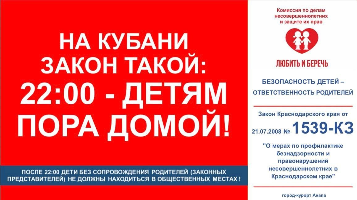 ✅На Кубани закон такой: 22:00 - детям пора домой! ⚠️Напоминаем, что, согласно региональному законодательству, дети без сопровождения взрослых не должны находиться в общественных местах: 📍до 7 лет — круглосуточно, 📍от 7 до 18 лет — с 22:00 до 06:00. Для родителей предусмотрены меры административной ответственности.