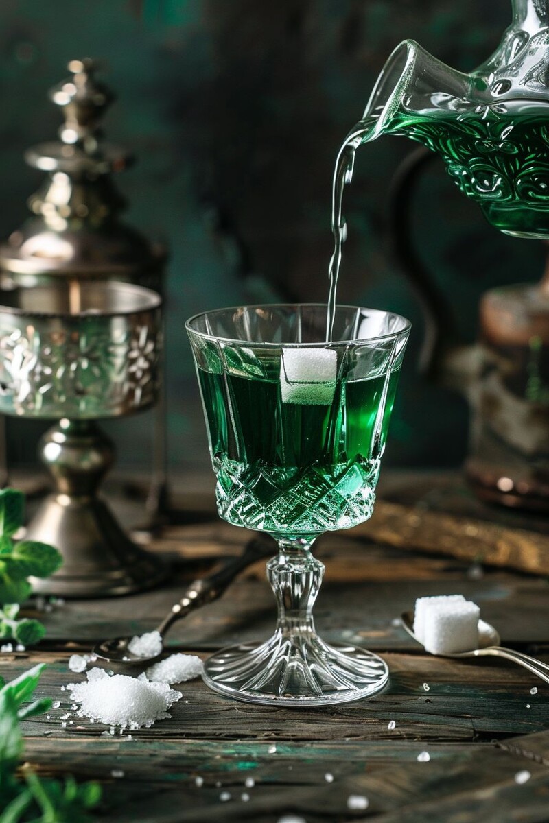 Абсент — крепкий алкогольный напиток на основе экстракта горькой полыни. В состав обычно входят анис, фенхель, мята и другие травы. Он характерного зеленого цвета.