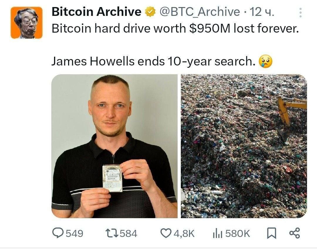 Жаль этого добряка 🫡 Думаю, многие слышали эту историю: в 2013 году Джеймс Хауэллс случайно выбросил жёсткий диск, где хранилось 8000 BTC, а сегодня их стоимость составляет почти $950млн. Более 10 лет он рылся на свалке, пытаясь найти тот самый диск, но сегодня официально прекратил поиски. Это история показывает, как легко можно потерять целое состояние в крипте по невнимательности, поэтому храните скидки в надёжных местах. ✈Bybit (https://partner.bybit.com/b/43818) | Chat | Admin