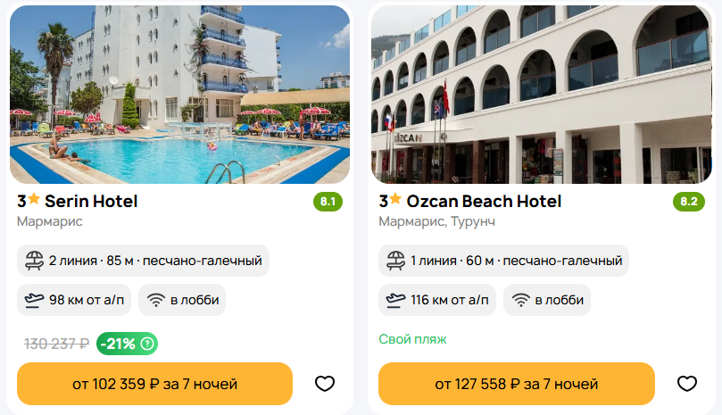 🔥 Туры в Мармарис на "всё включено" из Москвы на 7-13 ночей 🔥 Парочка выгодных вариантов: Тур в отель 3⭐️Serin Hotel, до пляжа 85 м, Мармарис, от 7 ночей, всё включено, прямой чартерный. Вылет 12 августа, от 51180 руб/чел Забронировать: https://checkintime.ru/r9sw Тур в отель 3⭐️Ozcan Beach Hotel, до пляжа 60 м, Мармарис, от 7 ночей, всё включено, прямой чартерный. Вылет 12 августа, от 63780 руб/чел Забронировать: https://checkintime.ru/3azs Тур в отель 4⭐️Marmaris Park, до пляжа 60 м, Мармарис, от 7 ночей, всё включено, прямой чартерный. Вылет 12 августа, от 92790 руб/чел Забронировать: https://checkintime.ru/5qg6 Все предложения: https://checkintime.ru/mlps ⚠️Цены на момент публикации и указаны на одного человека с перелетом и проживанием. Переходя по ссылке цена отобразиться на 2-х человек 🏖 Поиск туров | ✈️Авиабилеты