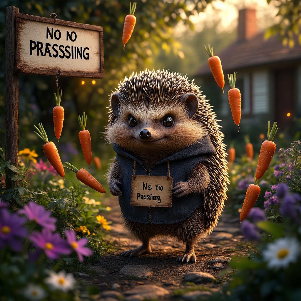 В одном волшебном лесу жил-был ёж по имени Федя. Был он очень жадным и никому не хотел делиться своими припасами. Особенно гордился он своей грядкой волшебных морковок, которые светились в темноте и могли исполнять желания. Каждое утро Федя тщательно поливал свои морковки, охраняя их от всех лесных жителей, и даже повесил табличку «Посторонним вход воспрещён! Моё!». Однажды ночью Федя проснулся от странного света. Выглянул он в окошко и увидел, как его морковки сами собой выпрыгнули из грядки и пустились танцевать по лесу. Они кружились в воздухе, словно маленькие светлячки, оставляя за собой светящиеся следы. — Стойте! Вернитесь! — закричал Федя, но морковки только хихикнули и побежали дальше, насвистывая весёлую мелодию. Прибежали они к зайчихе Маше, которая грустила, что у неё нет морковки на зиму. Маша сидела на пеньке и тихонько всхлипывала, глядя на свои пустые запасы. — Возьми нас, — сказали морковки, окружив её светящимся хороводом. — Мы хотим помочь! Маша так обрадовалась, ч