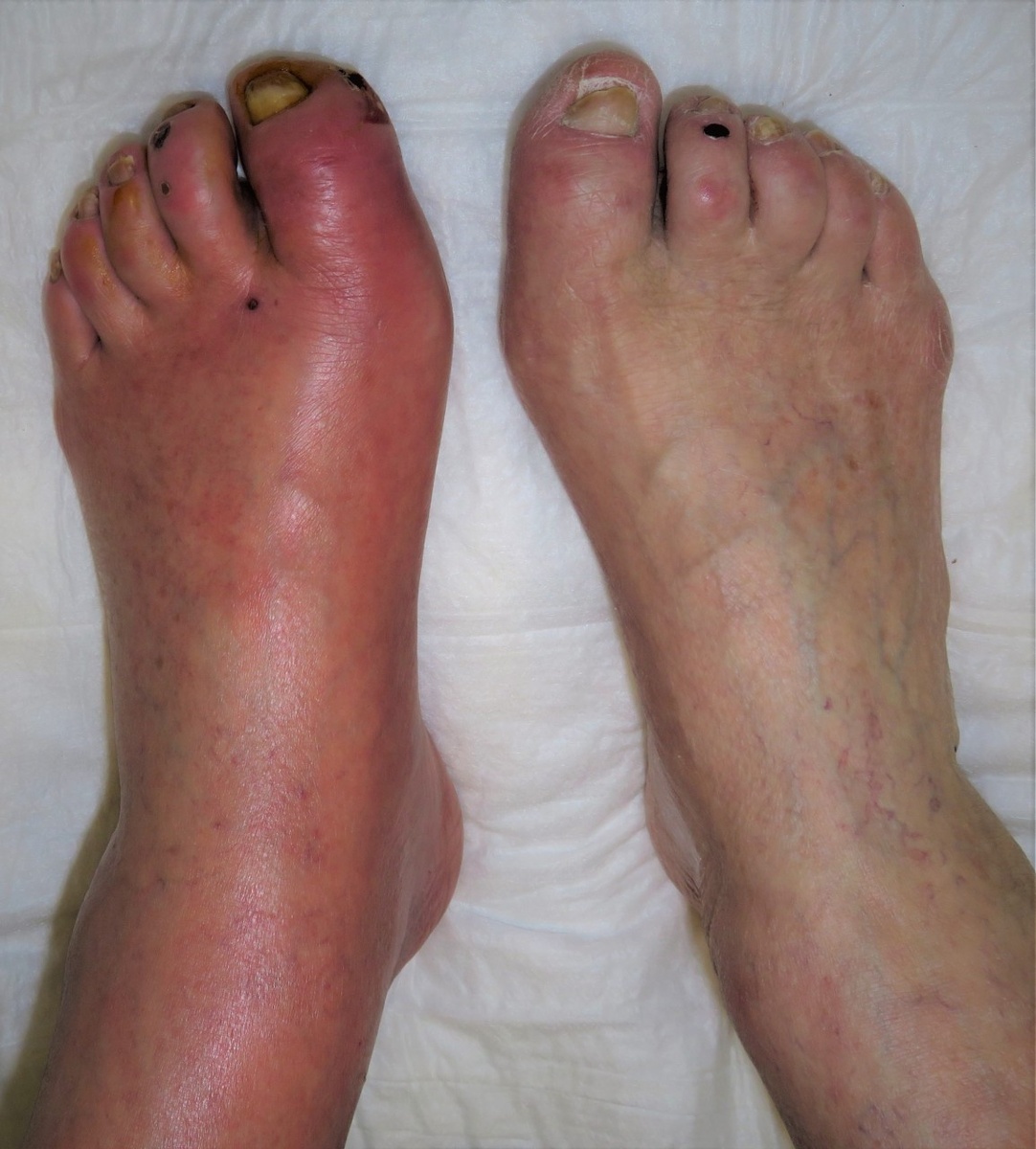 Существует ошибочное суждение о том, что в пожилом возрасте «уже» не нужно, да и невозможно лечить ноги, пораженные диабетической язвой или гангреной. По этой причине во всём мире ежеминутно проводятся ампутации конечностей. Следует помнить, что в возрасте 80-90 лет ампутация может оказаться смертельной для человека. Если до ампутации люди обычно могут самостоятельно, хоть и с болью, перемещаться, обслуживать себя, то после ампутации они оказываются прикованными к постели, что ведет за собой образование пролежней, развитие пневмонии и другие осложнения «лежачего» образа жизни, не говоря уже о тяжелых психологических проблемах. Обычно пожилые люди после ампутации конечности не проживают и полугода. Специалисты Центра профилактики ампутаций Ильинской больницы уверены: лечить и спасать ноги можно и нужно в любом возрасте. ПАЦИЕНТ 1, 83 ГОДА В конце декабря 2021 г. обнаружен дефект кожи 1 пальца левой стопы, с умеренными болями покоя. Лечился дома, проводил перевязки с мазью Бетадин, прове