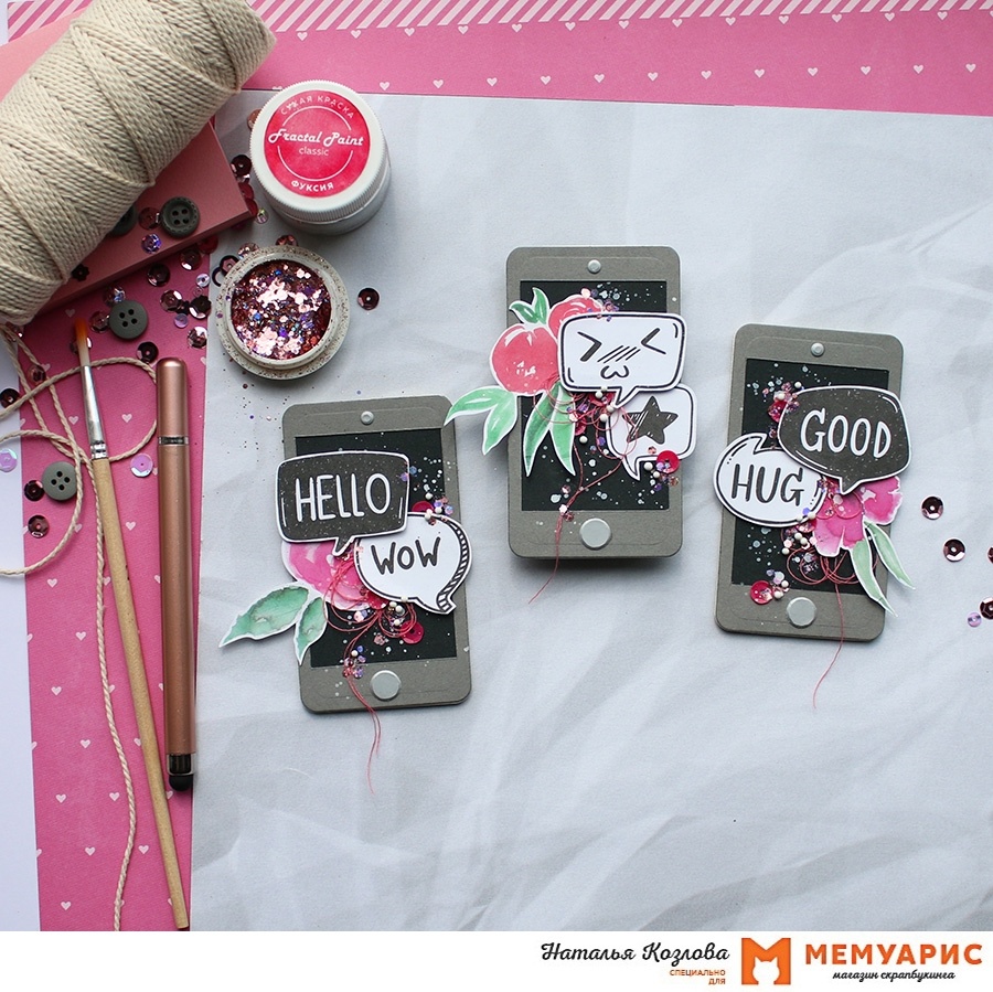 Или напиши ))) Привет, друзья! С вами Наташа и сегодня у меня для вас серия АТС… Идею для создания этих необычных карточек мне подсказали листы для вырезания из коллекции «Мир фантазий» от Paper Home. Эти милейшие bubble cloud с надписями и смайликами мне сразу приглянулись. Так и получились в итоге такие чудные чаты с сообщениями )) В основе смартфонов хороший такой бутерброд из различного кардстока и переплетного картона )) Сама форма у меня получилась благодаря ножу из набора «Самое важное» от Mimicut. В самом верхнем слое мне оставалось лишь вырезать канцелярским ножом отверстие для экрана. В оформлении мне пригодились цветы, нитки, пайетки и немного брызг белой акриловой краской. В качестве топпинга у меня розовые блёстки и декоративные камешки белые от FractalPaint. Надеюсь вам понравилась идея! На этом буду заканчивать! До скорых встреч
