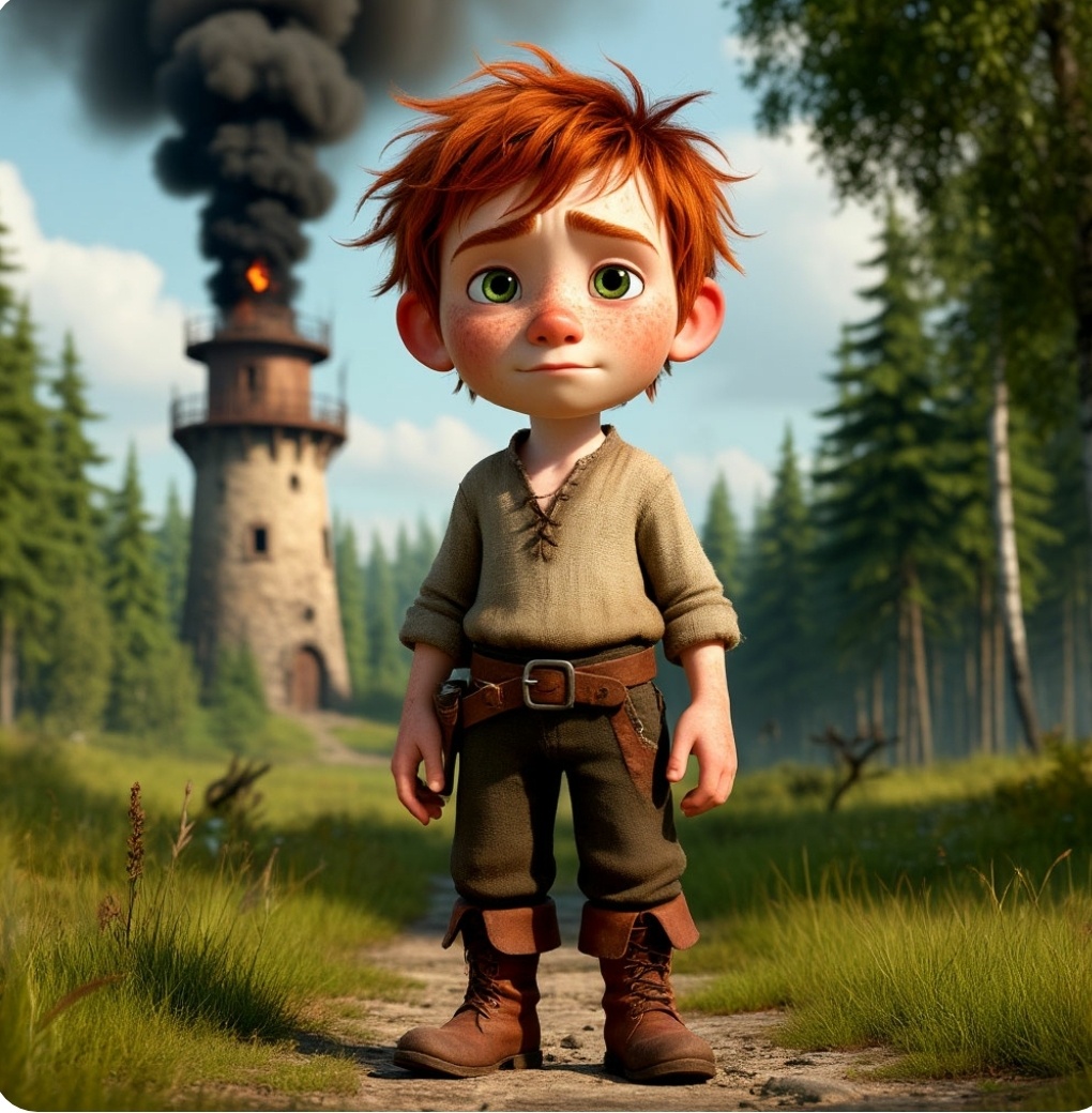 К Башне сбежалась вся деревня. И увидели они фигурку: рыжие вихры торчали во все стороны, лицо в саже и масле, рубаха порвана, но глаза сияли ярче солнца. А на ногах, гордо стоявших в луже, – верные лапти.