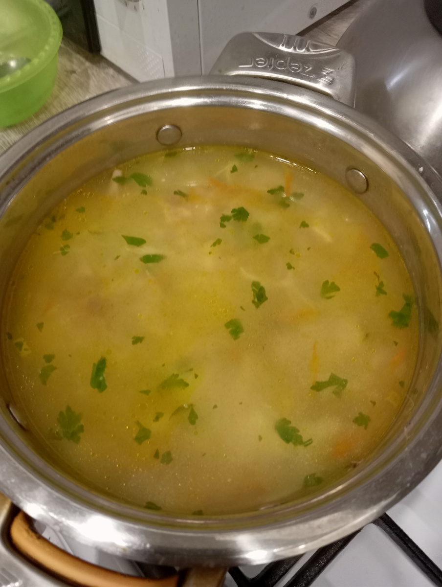 04.08.2025 г. Понедельник Здравствуйте! Мы сегодня ночевали у родителей и это была очень тяжёлая ночь. Жара у нас так и не спадает, спасаемся дома кондиционером. А у родителей кондиционера нет. Всю ночь как в бане - жарко, душно, потно. Ближе к утру начался небольшой дождь и настала долгожданная прохлада. С ночёвкой ездили вынуждено - у мамы сегодня был прием у стоматолога, а нам нужно было подежурить с отцом. Бабушка вернулась и мы отправились домой. У нас на сегодня были планы на вечер. Дочь пригласили на день рождения к подруге. Поэтому приехали домой, привели себя в порядок, собрали подарок и поехали отмечать. Ну конечно день наш не обошёлся без домашних дел. Как обычно несколько стирок с развешиванием сырого и разбором сухого белья. Ну и готовка само собой. Был готовый куриный бульон. На нём приготовила вот такой красивый суп. Очень давно не готовила рисовый суп. Сегодня это исправила. Перед отъездом на день рождения замариновала маленького цыплёнка - корнишона и начистила картош