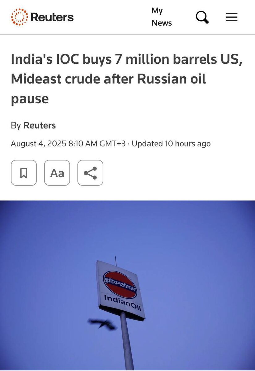 π’ ΠΠ½Π΄ΠΈΡ ΡΠ΅Π·ΠΊΠΎ ΡΠ²Π΅Π»ΠΈΡΠΈΠ»Π° Π·Π°ΠΊΡΠΏΠΊΡ Π½Π΅ΡΡΠΈ Π² Π‘Π¨Π ΠΈ Π½Π° ΠΠ»ΠΈΠΆΠ½Π΅ΠΌ ΠΠΎΡΡΠΎΠΊΠ΅, ΡΡΠΎΠ±Ρ Π·Π°ΠΌΠ΅ΡΡΠΈΡΡ Π ΠΎΡΡΠΈΡ ΠΠ½Π΄ΠΈΠΉΡΠΊΠ°Ρ Π½Π΅ΡΡΡΠ½Π°Ρ ΠΊΠΎΡΠΏΠΎΡΠ°ΡΠΈΡ, ΠΊΡΡΠΏΠ½Π΅ΠΉΡΠΈΠΉ Π½Π΅ΡΡΠ΅ΠΏΠ΅ΡΠ΅ΡΠ°Π±ΠΎΡΡΠΈΠΊ ΠΠ½Π΄ΠΈΠΈ, Π·Π°ΠΊΡΠΏΠΈΠ»Π° 7 ΠΌΠΈΠ»Π»ΠΈΠΎΠ½ΠΎΠ² Π±Π°ΡΡΠ΅Π»Π΅ΠΉ ΡΡΡΠΎΠΉ Π½Π΅ΡΡΠΈ Π΄Π»Ρ ΠΏΠΎΡΡΠ°Π²ΠΊΠΈ Π² ΡΠ΅Π½ΡΡΠ±ΡΠ΅. ΠΠ΅ΡΡΡ ΠΏΡΠΈΠΎΠ±ΡΠ΅Π»ΠΈ Ρ Π‘Π¨Π, ΠΠ°Π½Π°Π΄Ρ ΠΈ ΠΠ»ΠΈΠΆΠ½Π΅Π³ΠΎ ΠΠΎΡΡΠΎΠΊΠ°. ΠΠ°ΠΊΡΠΏΠΊΠ° ΠΏΡΠΎΡΠ»Π° ΠΏΠΎΡΠ»Π΅ ΠΎΡΠΊΡΡΡΠΈΡ Π²ΠΎΠ·ΠΌΠΎΠΆΠ½ΠΎΡΡΠΈ ΠΏΠΎΡΡΠ°Π²ΠΎΠΊ Π½Π΅ΡΡΠΈ Π‘Π¨Π Π² ΠΠ·ΠΈΡ ΠΈ ΠΈΠ·-Π·Π° ΠΎΡΡΠ°Π½ΠΎΠ²ΠΊΠΈ Π·Π°ΠΊΡΠΏΠΎΠΊ ΡΠΎΡΡΠΈΠΉΡΠΊΠΎΠΉ Π½Π΅ΡΡΠΈ ΠΈΠ½Π΄ΠΈΠΉΡΠΊΠΈΠΌΠΈ Π³ΠΎΡΡΠ΄Π°ΡΡΡΠ²Π΅Π½Π½ΡΠΌΠΈ ΠΊΠΎΠΌΠΏΠ°Π½ΠΈΡΠΌΠΈ. ΠΡΠ΅Π·ΠΈΠ΄Π΅Π½Ρ Π‘Π¨Π ΠΠΎΠ½Π°Π»ΡΠ΄ Π’ΡΠ°ΠΌΠΏ ΡΠ°Π½Π΅Π΅ ΠΏΡΠ΅Π΄ΡΠΏΡΠ΅ΠΆΠ΄Π°Π», ΡΡΠΎ ΡΡΡΠ°Π½Ρ, ΠΏΠΎΠΊΡΠΏΠ°ΡΡΠΈΠ΅ Π½Π΅ΡΡΡ Ρ Π ΠΎΡΡΠΈΠΈ, ΠΌΠΎΠ³ΡΡ ΡΡΠΎΠ»ΠΊΠ½ΡΡΡΡΡ Ρ ΠΏΠΎΡΠ»Π΅Π΄ΡΡΠ²ΠΈΡΠΌΠΈ ΠΈΠ·-Π·Π° ΡΠ°Π½ΠΊΡΠΈΠΉ, Π²Π²Π΅Π΄ΡΠ½Π½ΡΡ