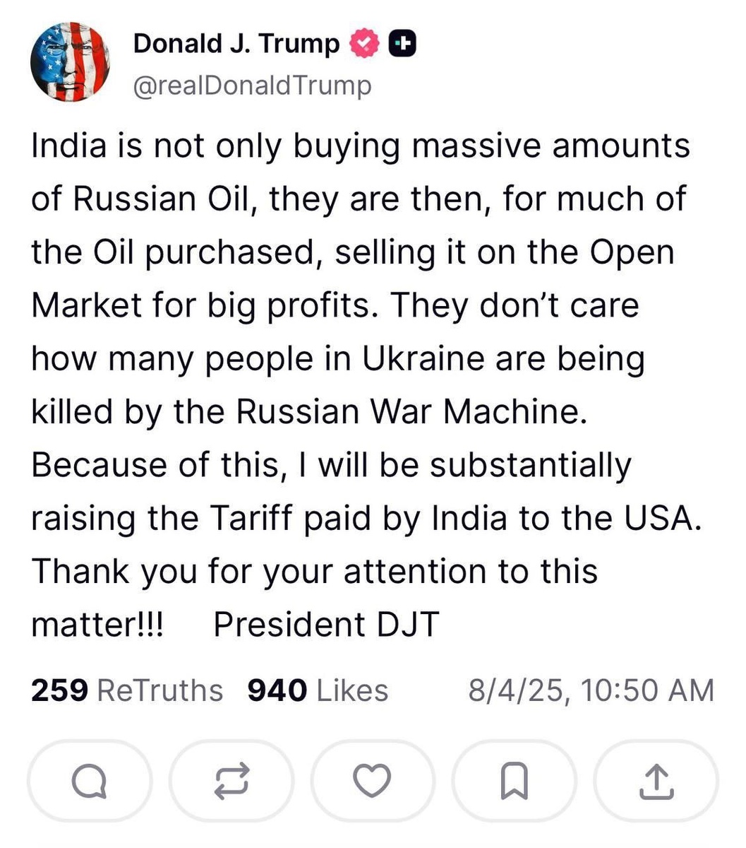 π¬ Π’ΡΠ°ΠΌΠΏ Π·Π°ΡΠ²ΠΈΠ», ΡΡΠΎ Π·Π½Π°ΡΠΈΡΠ΅Π»ΡΠ½ΠΎ ΠΏΠΎΠ²ΡΡΠΈΡ ΠΏΠΎΡΠ»ΠΈΠ½Ρ Π² ΠΎΡΠ½ΠΎΡΠ΅Π½ΠΈΠΈ ΠΠ½Π΄ΠΈΠΈ Π·Π° ΠΈΠΌΠΏΠΎΡΡ ΠΈ ΠΏΠ΅ΡΠ΅ΠΏΡΠΎΠ΄Π°ΠΆΡ ΡΠΎΡΡΠΈΠΉΡΠΊΠΎΠΉ Π½Π΅ΡΡΠΈ "ΠΠ½Π΄ΠΈΡ Π½Π΅ ΡΠΎΠ»ΡΠΊΠΎ ΠΏΠΎΠΊΡΠΏΠ°Π΅Ρ ΠΎΠ³ΡΠΎΠΌΠ½ΡΠ΅ ΠΎΠ±ΡΡΠΌΡ ΡΠΎΡΡΠΈΠΉΡΠΊΠΎΠΉ Π½Π΅ΡΡΠΈ, Π½ΠΎ ΠΈ ΠΏΡΠΎΠ΄Π°Π΅Ρ Π΅Ρ Π±ΠΎΠ»ΡΡΡΡ ΡΠ°ΡΡΡ Π½Π° ΠΎΡΠΊΡΡΡΠΎΠΌ ΡΡΠ½ΠΊΠ΅, ΠΏΠΎΠ»ΡΡΠ°Ρ ΠΎΠ³ΡΠΎΠΌΠ½ΡΡ ΠΏΡΠΈΠ±ΡΠ»Ρ. ΠΠΌ Π²ΡΡ ΡΠ°Π²Π½ΠΎ, ΡΠΊΠΎΠ»ΡΠΊΠΎ Π»ΡΠ΄Π΅ΠΉ Π½Π° Π£ΠΊΡΠ°ΠΈΠ½Π΅ ΠΏΠΎΠ³ΠΈΠ±Π°Π΅Ρ ΠΎΡ ΡΡΠΊ ΡΠΎΡΡΠΈΠΉΡΠΊΠΎΠΉ Π²ΠΎΠ΅Π½Π½ΠΎΠΉ ΠΌΠ°ΡΠΈΠ½Ρ. Π ΡΠ²ΡΠ·ΠΈ Ρ ΡΡΠΈΠΌ Ρ Π·Π½Π°ΡΠΈΡΠ΅Π»ΡΠ½ΠΎ ΠΏΠΎΠ²ΡΡΡ ΠΏΠΎΡΠ»ΠΈΠ½Ρ, Π²ΡΠΏΠ»Π°ΡΠΈΠ²Π°Π΅ΠΌΡΠ΅ ΠΠ½Π΄ΠΈΠ΅ΠΉ Π‘Π¨Π. ΠΠ»Π°Π³ΠΎΠ΄Π°ΡΡ Π²Π°Ρ Π·Π° Π²Π½ΠΈΠΌΠ°Π½ΠΈΠ΅ ΠΊ ΡΡΠΎΠΌΡ Π²ΠΎΠΏΡΠΎΡΡ!!!", β Π½Π°ΠΏΠΈΡΠ°Π» ΠΏΡΠ΅Π·ΠΈΠ΄Π΅Π½Ρ Π‘Π¨Π ΠΠΎΠ½Π°Π»ΡΠ΄ Π’ΡΠ°ΠΌΠΏ Π² ΡΠΎΡΡΠ΅ΡΠΈ Truth. Π’ΡΠ°ΠΌΠΏ ΠΏΠΎ ΡΡΡΠΈ Ρ