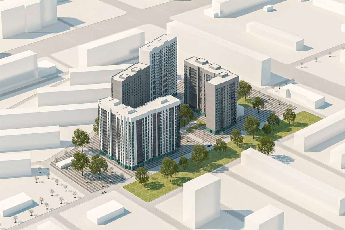 Для отделки используют зеленый керамогранит и светлые фиброцементные панели. Секции выстроят вокруг двора, что позволит создать приватную озелененную территорию для жильцов. Здесь установят детские и спортивные площадки, сделают зоны отдыха.