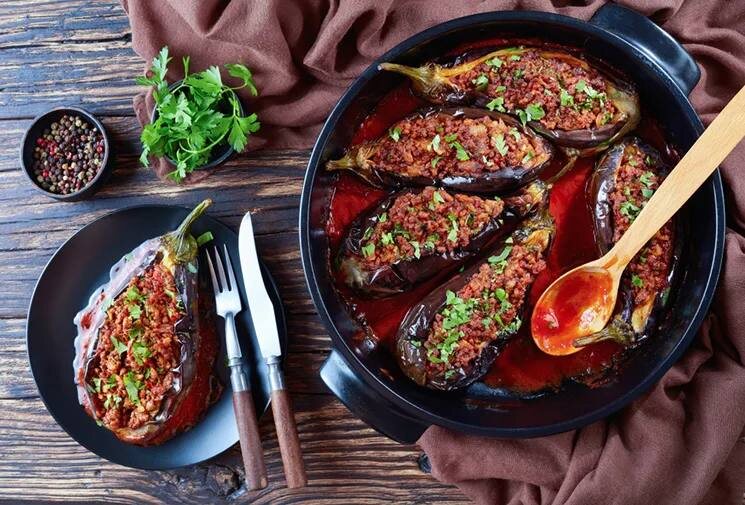 Карныярык: история и интересные факты •Название блюда Карныярык (в переводе с турецкого буквально «вспоротый живот») — традиционное турецкое блюдо, которое получило своё название благодаря внешнему виду. Баклажаны разрезаются вдоль, фаршируются и напоминают раскрытый карман. •Происхождение Это блюдо имеет глубокие корни в турецкой кухне и является одним из самых популярных в регионе. Фаршированные баклажаны готовили ещё в древние времена, и рецепт передавался из поколения в поколение. •Особенности блюда Карныярык считается праздничным блюдом в турецкой кухне. Его часто готовят на важные торжества и семейные ужины. Особенность блюда заключается в сочетании нежной текстуры баклажанов и сочной мясной начинки. •Интересные факты -В разных регионах Турции могут использоваться различные вариации начинки и специй. -Традиционно для карныярыка используется говяжий фарш, хотя в современных рецептах допускается использование и других видов мяса. -Блюдо часто подают на больших праздниках и свад