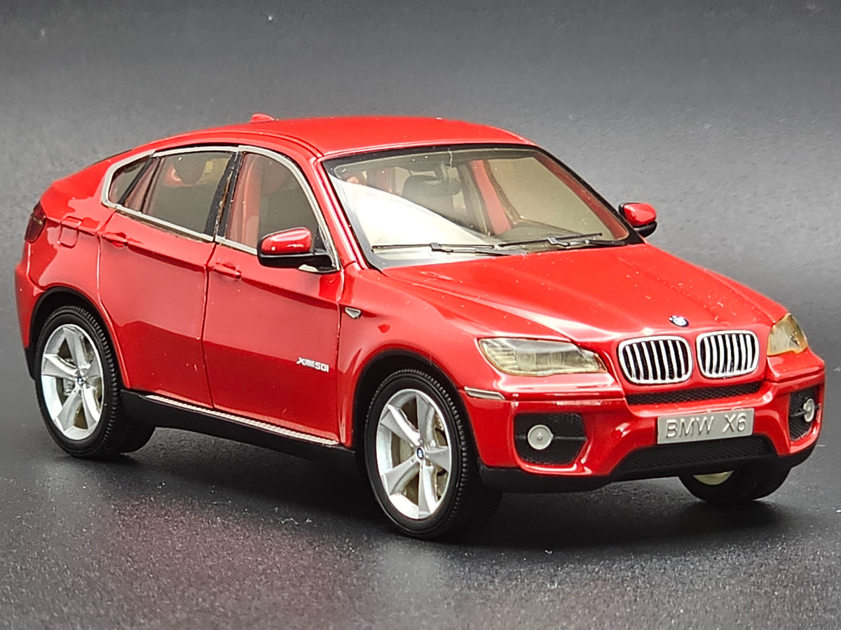 Фотообзор модели BMW X6 E71 red 2008 от компании FLine (Lucky Models) в масштабе 1/43. Про качественную модель BMW X6 E71 от компании Schuco в 43 масштабе и справку про настоящий автомобиль можно посмотреть здесь - https://dzen.ru/a/aC9zBDAsXitbJ7Nu?share_to=link Поэтому сосредоточимся на модели. Артикул производителя LKM0301. Материал - смола. Модель сделана в Китае. Количество изготовленных экземпляров не указано. Цвет - красный, не металлик. Насколько мне известно BMW X6 E71 окрашивался на заводе в красный цвет, только металлик. Помимо красного, FLine выпустила данную модель в чёрном глянцевом цвете и чёрном матовом варианте. Тиражи не указаны. Донышко отдалённо похоже на Х6, но только с двигателем - рядной шестёркой. Здесь Schuco точнее и деталированнее. Остекление и оптика выполнены из прозрачной смолы, которая со временем пожелтела (хотя модель под солнечными лучами не находилась). Линзы фар и противотуманок выполнены из травления. Из травления так же имитация сеток в переднем ба