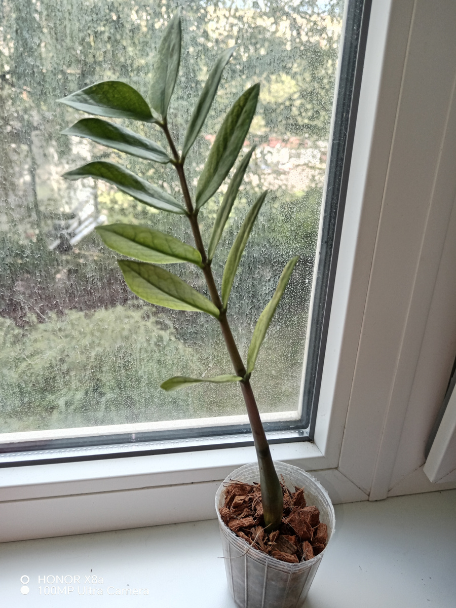 Здравствуйте! Наверное большая часть аудитории задаётся вопросом покупать ли замиокулькасы из Тайланда. Многие скорее всего столкнулись с адаптацией растения и при этом не важно какого сорта замиокулькас. Любое абсолютно растение проходит этап адаптации. Само растение ко мне пришло примерно за четыре дня. Выглядило здоровым. Посажен в кокосовый грун. По приезду замик я трогать не стала дала время ему "прийти немного в себя". Но спустя неделю решила пересадить растение в мох. От знатоков и просто любителей была наслышана, что замиокулькасы обожают мох, но не все сорта. По прошествию недели увидела увядание листвы, вытащив растение заметила гниение клубня, оставлять его не стала решила полностью удалить. Кстати говоря растение пришло ко мне с клубнем, но без корней, а бывает полностью да наоборот. Подсушила срез, обработала его укоренителем фитоклоном и решила не сажать не в мох, не в грунт и даже не остановилась на фетиле. Переукоренить растишку решила в воде, но с добавлением волшебног