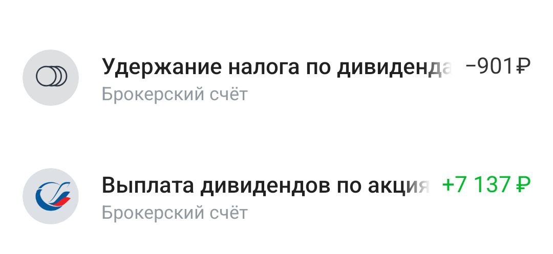 ⚡1-го августа пришли дивиденды от Транснефти На мои 36 акций пришло 7137₽, из них удержали на налоги 901₽. Чистый доход 6236₽ Дивидендная доходность на мои 36 акций, грязными 14.55% или чистыми 12.71% 📌Дивиденды были отправлены на покупку лота Лучка, тогда цена как раз корректировалась до 6 тысяч рублей