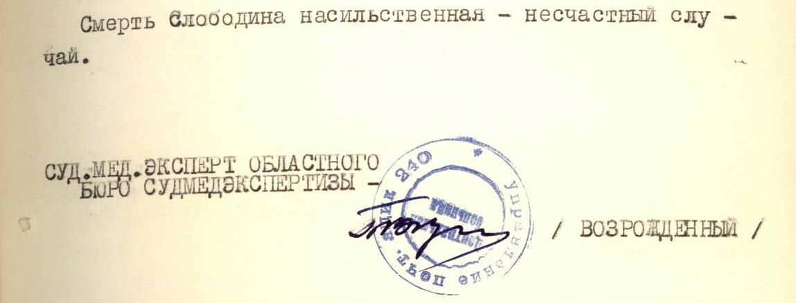Моё мнение: Слободин умер вследствие конкурирующей причины - токсический отёк лёгких при вдыхании пульмонотоксикантов (ставлю на этот диагноз 95%), либо, что менее вероятно, но всё таки вероятно, именно данная причина привела к обмороку, коме и способствуя скорейшему замерзанию, явилась первопричиной. Но вывод единственно верный: «Смерть Слободина насильственная – несчастный случай». При рассмотрении деталей последующих Актов первой пятёрки будут и иные, дополнительные доказательства общей картины смертей.