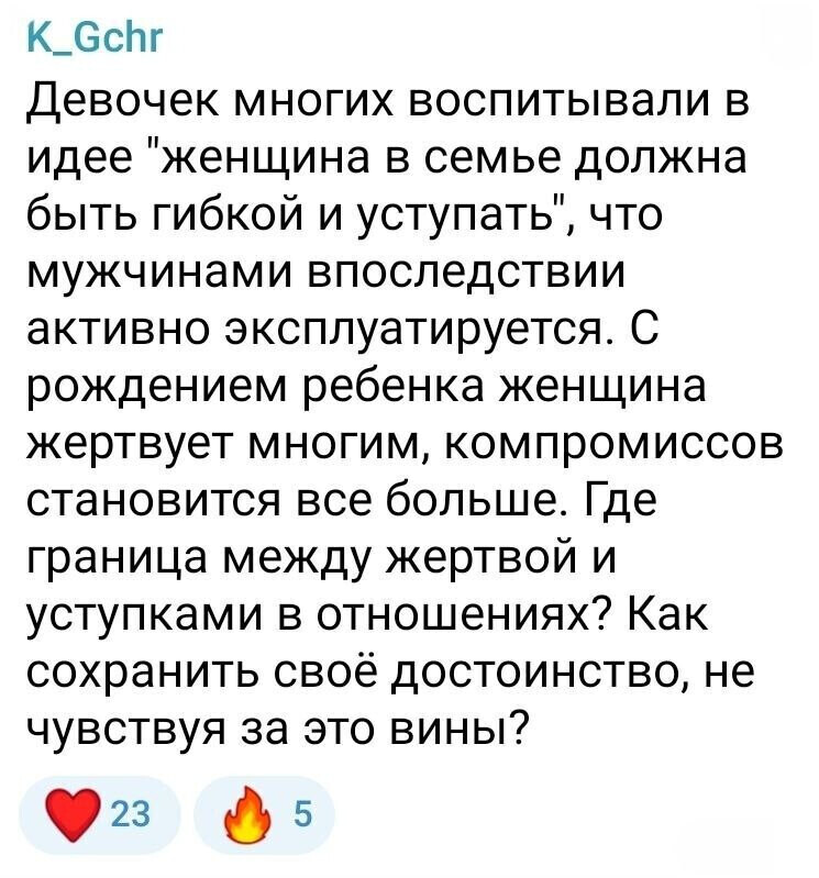 Также и у мужчин вопрос стоит, где грань между аленизмом и заботливым супружеством. И вопрос ваш именно отсюда - где же грань между жертвой и уступками?