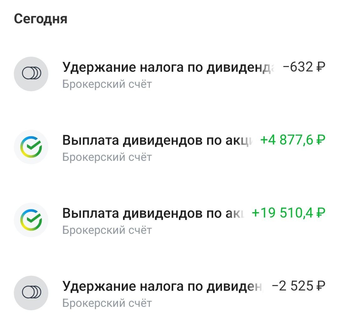 ⚡А уже сегодня пришли дивиденды от Сбербанка На мои 140 обыкновенных акций пришло 4877.6₽, из них удержали на налоги 632₽. Чистый доход 4245.6₽ Дивидендная доходность на мои 140 обыкновенных акций, грязными 14.57% или чистыми 12.68% На мои 560 привилегированных акций пришло 19510.4₽, из них удержали на налоги 2525₽. Чистый доход 16985.4₽ Дивидендная доходность на мои 560 привилегированных акций, грязными 13.4% или чистыми 11.66% 📌Суммарно чистыми пришло 21231₽. За первое полугодие 2025 я суммарно со всех инструментов чистыми получил 40100₽, а тут только выплата от одной компании уже больше половины прошлого дохода. На мой взгляд результат получился очень хорошим. Если посчитать ещё выплаты от Транснефти и Роснефти, то за два месяца я должен обогнать по доходу первое полугодие.