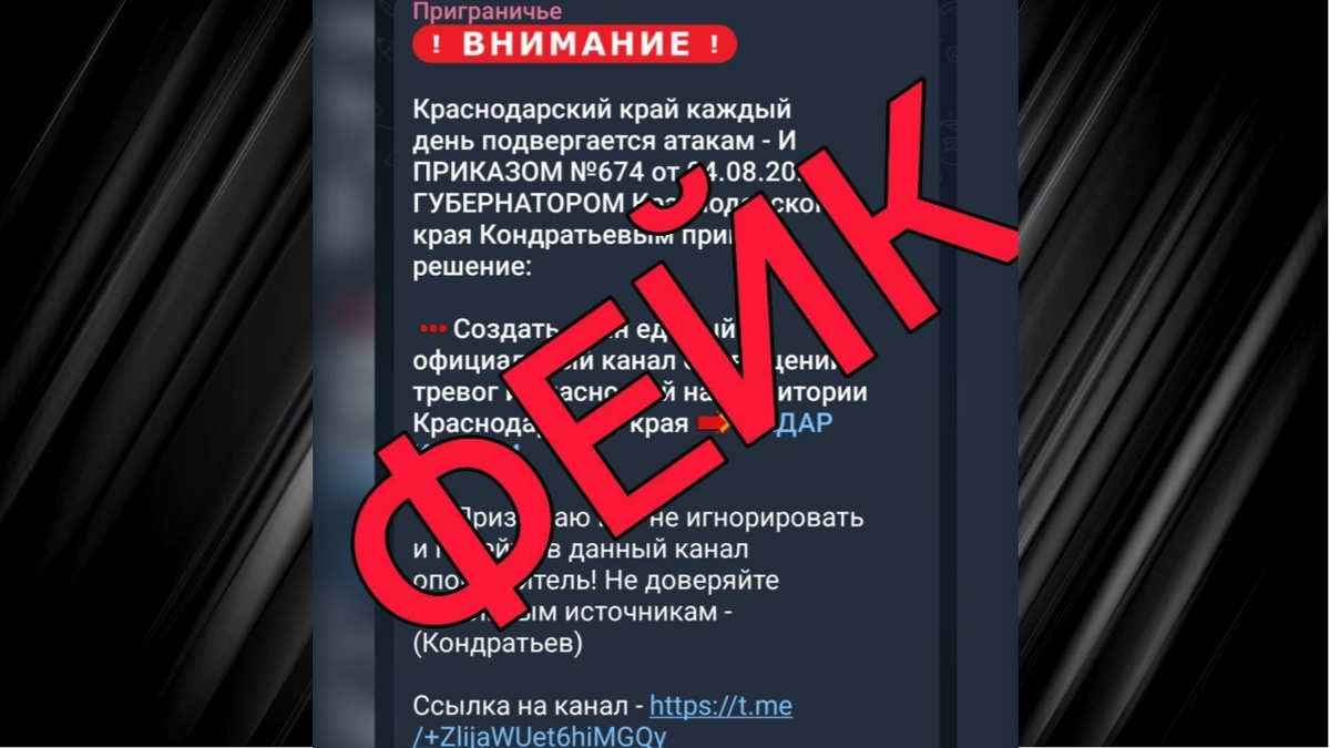 В социальных сетях активно распространяется сообщение о том, что губернатор Краснодарского края издал приказ о создании нового Telegram-канала для оперативного оповещения жителей о возможных тревогах и опасностях. Сообщение содержит призыв подписаться на этот канал. Но власти края официально заявили: это фейк.