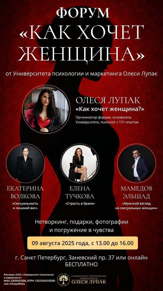 САМОЕ ГОРЯЧЕЕ МЕРОПРИЯТИЕ ЭТОГО ЛЕТА! Запишите себе: 9 августа 2025г, Санкт-Петербург Впервые! Университет психологии и маркетинга Олеси Лупак впервые проведет оффлайн форум для женщин КАК ХОЧЕТ ЖЕНЩИНА Там будет все: прекрасная атмосфера, женское комьюнити, подарки, велком-шампанское, жгучий танец, крутые инсайты , которые ты получишь после форума и многое другое 🔥 Готова узнать как хочет твоя женщина? Вход на форум бесплатно, строго по билетам после регистрации Регистрация по ссылке: https://university-lupak.ru/forum