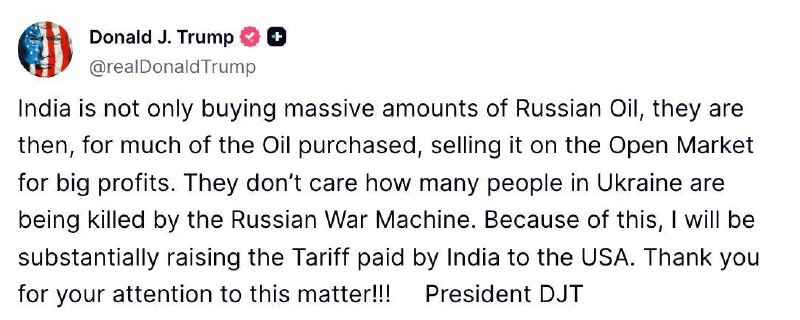 Трамп обвинил Индию в спекуляции российской нефтью и пообещал новые санкции Президент США Дональд Трамп вновь резко раскритиковал Индию за сотрудничество с Россией. По его словам, страна не только активно закупает российскую нефть, но и перепродаёт её с существенной прибылью, игнорируя последствия войны в Украине. "Индию совершенно не беспокоит, сколько людей гибнет от действий российской военной машины на Украине. В ответ я значительно увеличу тарифные ставки для Индии", — заявил Трамп. На данный момент таможенные пошлины на индийские товары в США составляют 25%. Новые меры могут быть введены в ближайшее время. Заря | Новости - Подписаться