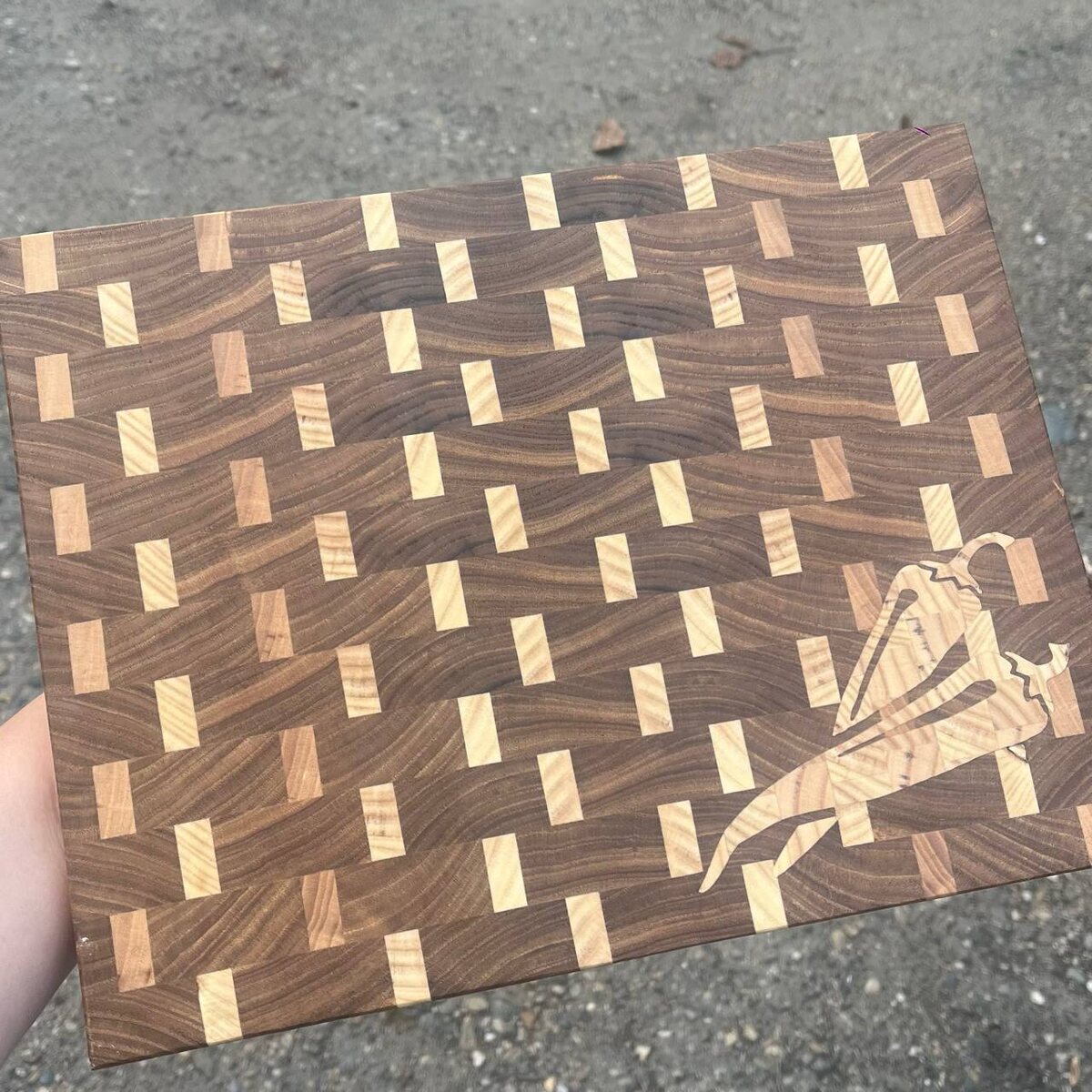 И вот, пожалуйста, торцевая доска из японской софоры и ясени + интарсия перчики.