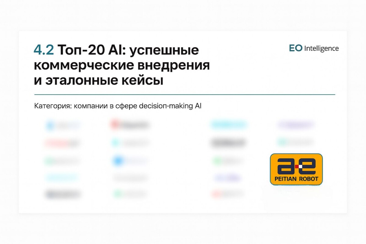 Главная новость: аналитическая платформа EO Intelligence опубликовала рейтинг-2025 «AI: коммерческие внедрения и эталонные кейсы». В нём 20 компаний, которые уже сегодня зарабатывают на искусственном интеллекте и меняют отрасли. PEITIAN ROBOT входит в этот список второй год подряд.