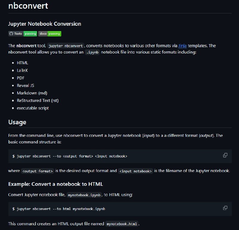 📔 nbconvert — это официальный инструмент проекта Jupyter для конвертации Jupyter Notebook (.ipynb) в различные форматы: HTML, PDF