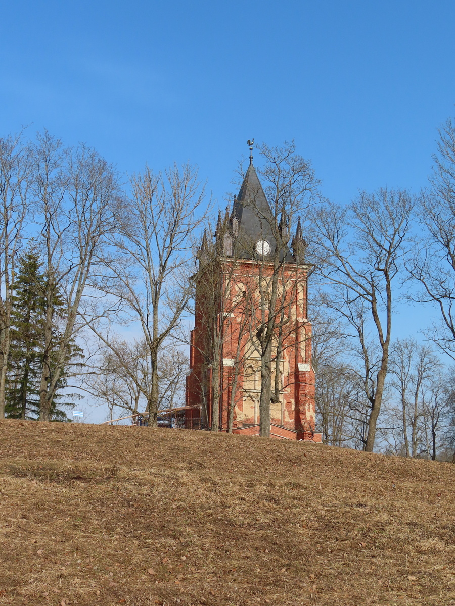 Башня Шапель стоит в южной части Александровского парка Пушкина. Она построена в 1825 – 1828 годах по проекту строителя, архитектора и садового мастера Адама Менеласа. Менелас родился в Шотландии, но всю вторую половину жизни жил и работал в России. Здесь его звали Адамом Адамовичем. В Царском Селе он построил Египетские ворота, Арсенал и Грот-родник, Белую Башню. Название «Шапель» происходит от французского слова chapelle – капелла, часовня. Шапель, в соответствии с тогдашней модой на древние развалины, с самого начала строилась как руины средневековой готической капеллы. «Изначальное» строение (на самом деле никогда не существовавшее) представляло собой две квадратные в плане башни и соединяющую их арку с расположенной над ней террасой. В соответствии с замыслом архитектора, одна из башен полностью «разрушилась» от времени, и от неё остались только фрагменты стен. «Сохранившаяся» башня увенчана высокой шатровой крышей с флюгером в виде петуха. Поэтому в Пушкине долгое время было в хо