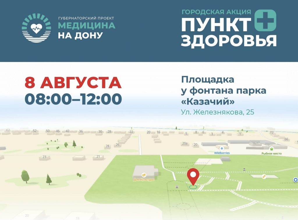 Жители города смогут пройти бесплатное обследование в парке «Казачий» в посёлке Соколово-Кундрюченский. Мероприятие проводится в рамках проекта «Медицина на Дону», инициированного губернатором региона. В рамках экспресс-диагностики будут доступны: Дата и время проведения: 8 августа, с 8:00 до 12:00 Парк «Казачий», возле фонтана. Важно знать: После осмотра терапевт проконсультирует участников и даст рекомендации по улучшению самочувствия.