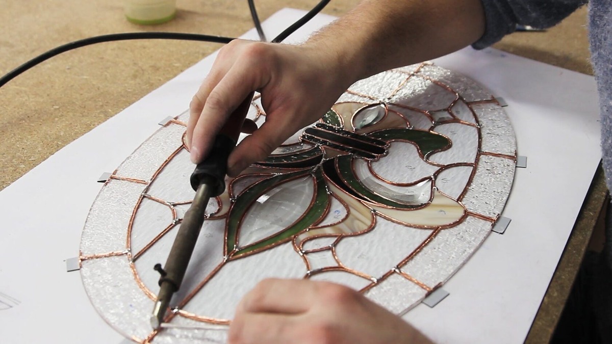 - Патинирование и очистка. После пайки витраж промывается, покрывается патиной, снова промывается и полируется. После этого — оформление в раму или крепление в нужное место.
