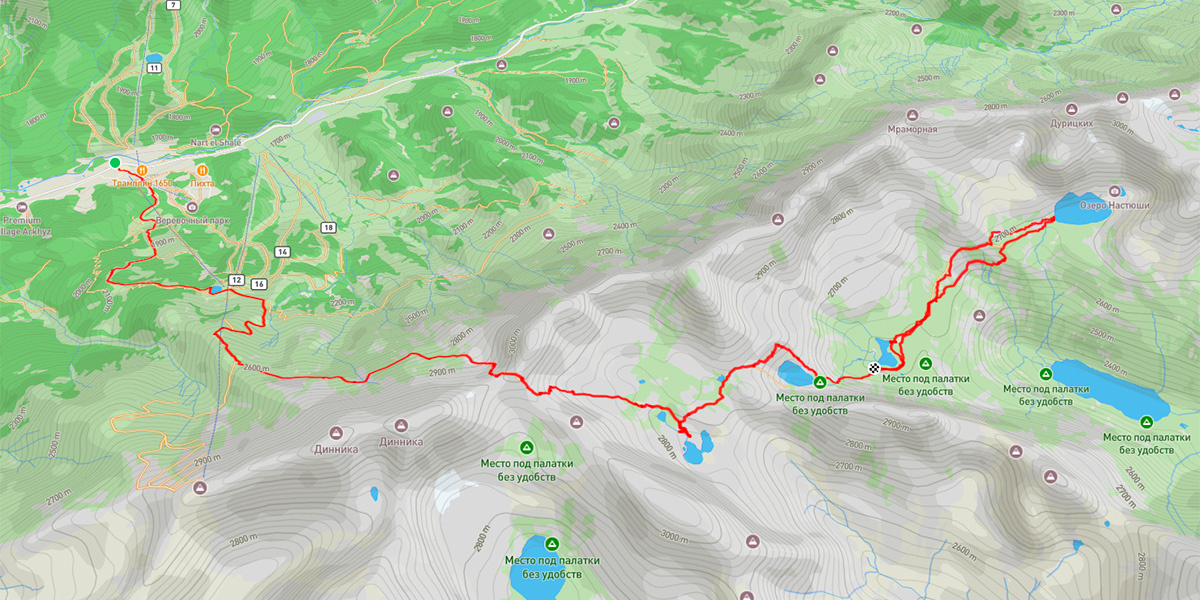 Все описанные мною маршруты носят ознакомительный характер, пожалуйста планируйте свои маршруты самостоятельно, на основе своей подготовки. Сложность легко Продолжительность 1.5 дня Трек похода nakarte.me Нитка маршрута гостиничный комплекс Романтик - оз Провальное, радиальный выход на оз. Лазурное - гостиничный комплекс Романтик Маршрут начинается от парковки напротив гостиничного комплекса Романтик. Подъем к верхней станции Лунный Экспресс (или нижней станции Орбита) в основном проходит по лыжной трассе. У станции Лунный Экспресс расположен искуственный водоем для генерации снега, где есть оборудованое место для отдыха со скамейками и столом (см. трек). Далее маршрут проходит по технологической дороге до так называемой "опоры №11" (видимо временной при строительстве станции "Орбита"), от нее тропа уходит влево, на перевал Федосеева. Пешую тропу к перевалу Федосеева раскопал эксковатор для проезда квадроциклов, теперь к перевалу Федосеева возят туристов, ранее сюда можно было добратьс