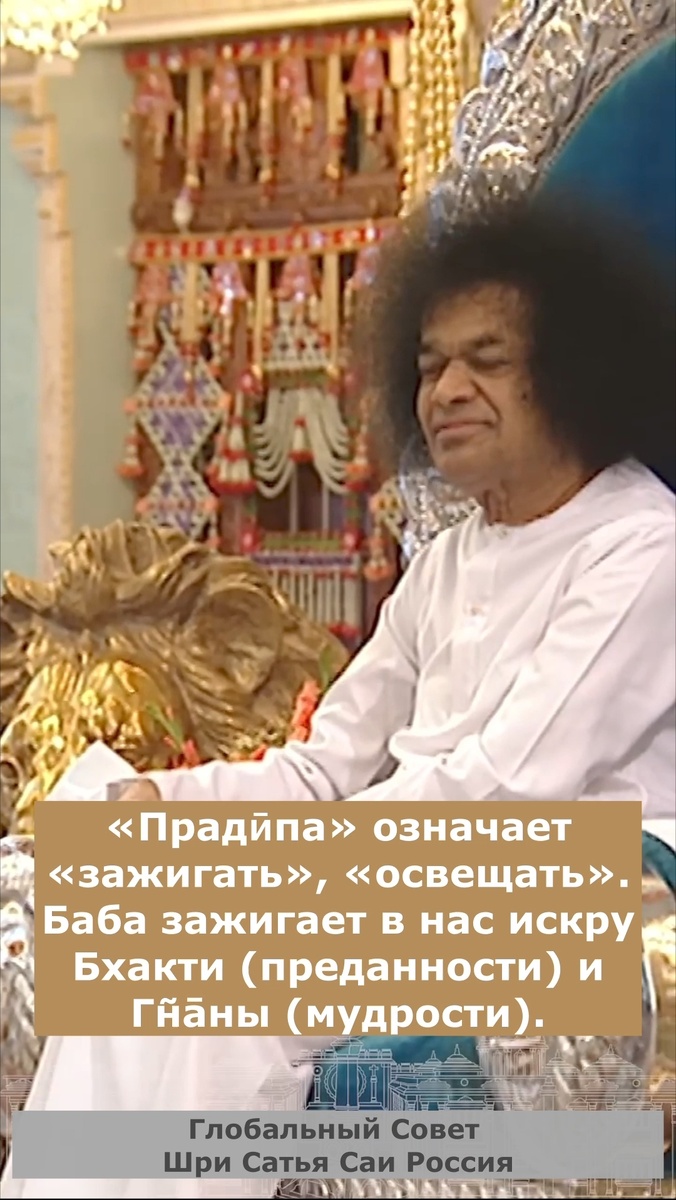 108 имён Шри Сатья Саи Бабы К 100-летию Бхагавана мы продолжаем воспевать 108 имён Шри Сатья Саи Бабы! 73. Ом Шрӣ Сāи Бхакти Гнāна Прадӣпāйа Намаха «Прадӣпа» означает «зажигать», «освещать». Баба зажигает в нас искру Бхакти (преданности) и Гнāны (мудрости). Он обращается к нам как «Атмā-сварӯпа», «Дивйāтмāсварӯпа». Он говорит: «Вы негодуете, когда вас называют «лжецами», потому что ваша истинная природа – Истина; вы негодуете, когда вас называют «уродливыми», потому что ваша истинная природа – Красота; вы негодуете, когда вас клеймят «порочными», потому что ваша истинная природа – Добродетель». Таким образом, Он вдохновляет нас поклоняться Вселенскому источнику всей Истины, Красоты и Добродетели, от Которого мы были обособлены и отделены. Он настаивает на том, чтобы мы задавали вопросы и пытались найти ответы на такие вопросы, как: «Кто я? Откуда я пришёл? И почему?», «В чём цель жизни?». Эти вопросы являются самой основой духовного знания и усилий. Бхакти, или преданно