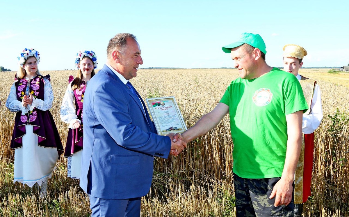 ⚡️Аграрии Шкловщины продолжают ставить рекорды на жатве. ✅Второй комбайнер в районе преодолел рубеж в тысячу тонн. Ряды тысячников пополнил труженик ЗАО «Большие Славени» Андрей Григорьев. ➡️Лидера прямо в поле поздравили с трудовой победой председатель Шкловского районного исполнительного комитета Сергей Бартош, первый заместитель председателя – начальник управления по сельскому хозяйству и продовольствию райисполкома Александр Диваков, председатель районной организации профсоюза работников АПК Алексей Дедков, представители сельхозорганизации. ✨По доброй традиции Андрею Ильичу вручили заслуженные награды, подарки. А на технике появилась наградная атрибутика, среди которой наклейка «Лидер трудового соревнования». 🪗🎶Музыкальное поздравление прозвучало от артистов районного Дома культуры.