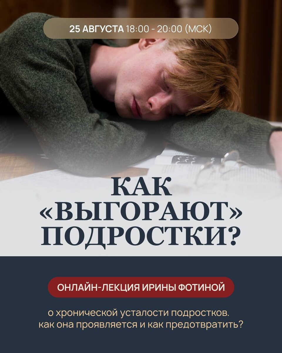 Как узнать и предотвратить выгорание и хроническую усталость подростков? Онлайн-лекция Ирины Фотиной Некоторым взрослым кажется, что только они устают и выгорают от нагрузок, обязанностей и ответственности. Что с детьми такого случиться не может… Но это не так. Дети и, особенно, подростки, как и взрослые, подвержены стрессу, хронической усталости, утрате целеполагания и выгоранию. Только выявить их и оказать помощь гораздо сложнее. Не все принимают, не все осознают. И поддержки не попросят — кто-то из упрямства, кто-то из страха, а кто-то от безнадёжности, зная, что всё равно не поверят, скажут, что «просто лень…». На этой лекции мы разберём все нюансы подросткового выгорания. Вы получите конкретные рекомендации, ответы на свои вопросы и помощь. ВОПРОСЫ ДЛЯ ОБСУЖДЕНИЯ: 🔥Выгорание. Хроническая усталость. Расстройство волевого спектра. Депрессия — что это, как их узнать, как не спутать с ленью и поведением из упрямства? 🔥Какие дети расположены к выгоранию? На каки