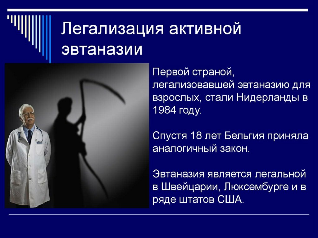 Эвтаназия проводится исключительно по воле самого больного, а не по решению врачей или родственников. Её цель — облегчить страдания и дать возможность уйти спокойно, без боли и унижения.