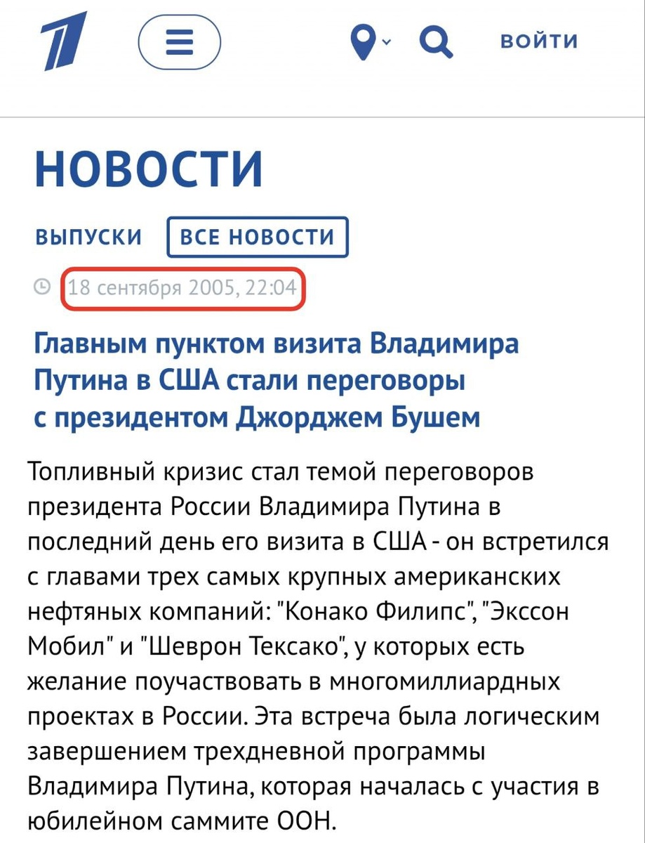 🗣Россия и США: обсуждение энергетического сотрудничества ~ 18 сентября 2005 года В последний день визита Владимира Путина в США ключевым событием стали переговоры с президентом Джорджем Бушем и главами трёх крупнейших американских нефтяных компаний — ConocoPhillips, ExxonMobil и ChevronTexaco. Основная тема переговоров — энергетическое сотрудничество. Американские компании выражали заинтересованность в участии в многомиллиардных проектах на территории России #Россия #США #Путин 🏛History_detail. Подписаться