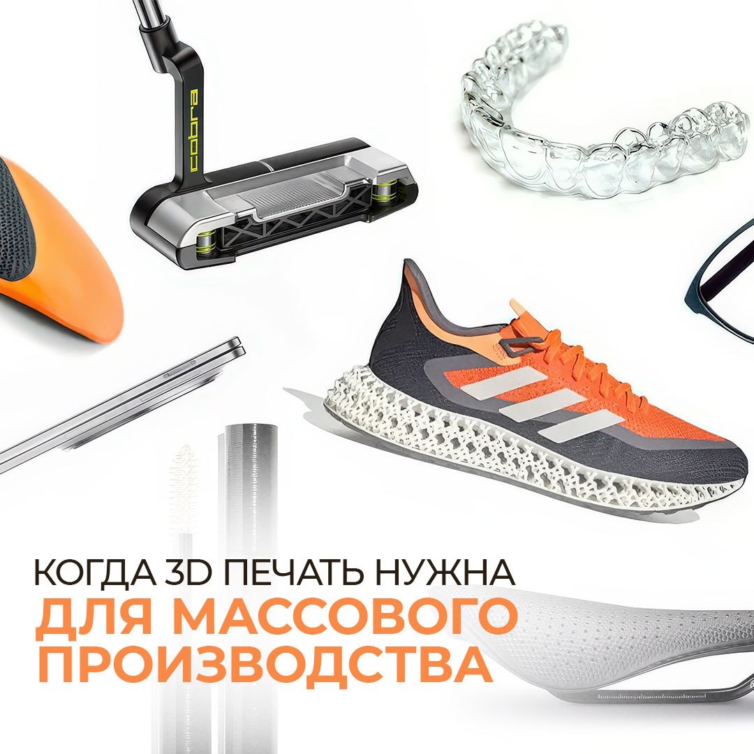 ⭐️Когда 3D печать нужна для массового производства Рассказываем о применении 3D печати. 🖨3D печать — это быстрый, дешевый и гибкий инструмент для создания прототипов и изготовления небольших партий уникальных деталей. Но имеет ли смысл использовать её для производства больших объемов? Распространенное мнение гласит, что при производстве более 10 000 экземпляров одной детали переход на литьё под давлением или другой традиционный метод производства становится более экономичным. Зачастую эффект масштаба проявляется при гораздо меньших объемах. Однако аддитивное производство обладает уникальными особенностями, которые при определенных обстоятельствах делают его не только более экономичным, но и более быстрым способом производства качественных и эффективных деталей. ⚙️Идея массового аддитивного производства не нова и уже реализуется известными компаниями, о которых мы расскажем ниже. Производители обращаются к 3D-печати для крупносерийного производства по трём основным причинам: 🔷Пр