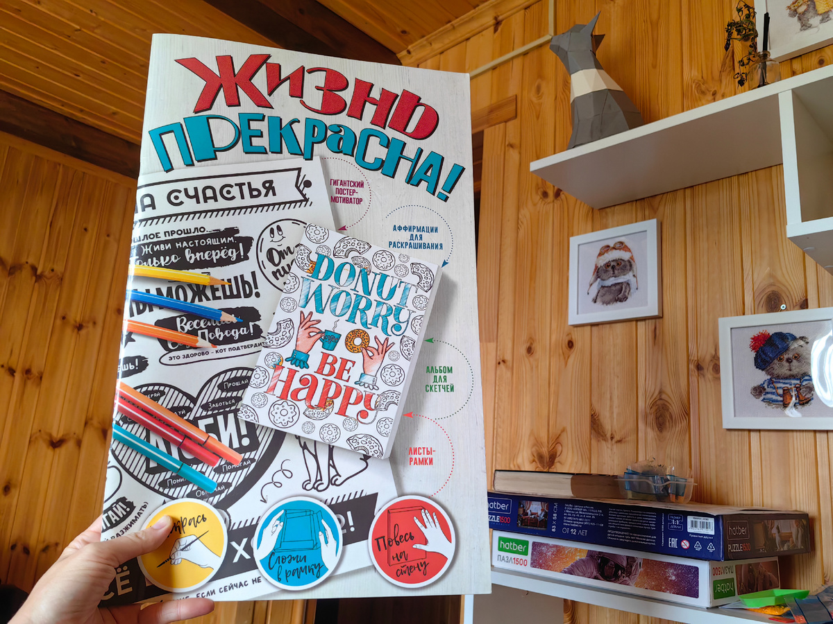 В прошлой статье я написал, что у меня есть другие хобби помимо вышивки крестиком. Пока текущий процесс движется к финишу, я периодически развлекаюсь другими "штуками". Расскажу сегодня про раскраску - мотивирующие надписи. У меня есть схожий, но вышивальный проект. Подобные надписи не раскрашиваются, а вышиваются. Эту серию работ я хочу повесить в городской квартире в коридоре. Я уже говорила о том, что надписи там максимально глупые, но смотрятся классно. А вот для деревенского дома таме картины, как мне кажется, смотрятся уже лучше. Итак, на фото выше сама книжка-раскрасска. На самом деле, у меня таких есть штуки 3 (не одинаковых). Как-то запюкупилась удачно в светофоре по приятной цене. В чем же прикол? А он в том, что после финиша картинки, ее можно собрать в импровизированную картинку. Конечно, тут нет рамки ка такой, но можно сделать объёмное изображение. Собирается основание достаточно легко. На каждой картинке-раскраске есть инструкция. Для остаточно всего раз пройтись по ней