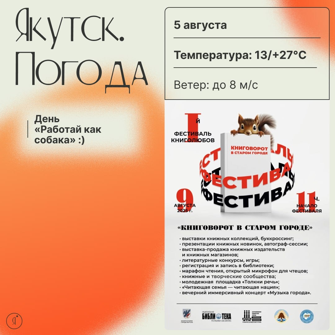 Доброе утро 🤩 Дорогие поэты, музыканты, писатели и все, кто влюблён в магию книг 🤩 9 августа Музей истории Якутска и сообщество книголюбов приглашают вас на первый фестиваль "Книговорот в Старом городе", приуроченный ко Всемирному дню книголюбов. Гостей праздника ожидает множество интерактивных площадок: книгообмен, книжные развалы, выставка коллекций книг, презентации новинок и продажа книг, автограф-сессии, литературные конкурсы. А также открытый микрофон: возможность прочитать свои любимые произведения или поделиться собственными стихами. Семейные программы: детские книги, дети-писатели, проект «Читающая семья – читающая нация». Вечерняя программа - иммерсивный концерт «Музыка города» от «Голос внутри» - группа Lisitca Band Алёна Лисица и Ким Захаров. 🤩 9 августа | 11:00-19:00 ул. Аммосова, Старый город 🤩 Заявки и вопросы: 8 (4112) 40-25-83 (с 10:00 до 18:00, кроме понедельника и вторника) Online Якутия | Подписаться